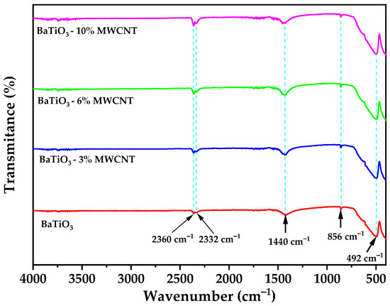 Figure 4 illustrates the FTIR spectra of pure BaTiO3 and BaTiO3/MWCNT nanocomposites. The observed spectral features include a characteristic band at around 492 cm−1, which is indicative of the Ti-O vibration mode. These spectral characteristics align with previous literature reports, thus affirming the crystal structure of BaTiO3 in the analyzed samples [57]. Additionally, a peak located at 865 cm−1 is observed, which corresponds to the in-plane and out-of-plane bending of C O 3 2 from BaCO3 [58]. The peak located at 1440 cm−1 corresponds to COO groups [59,60]. Furthermore, the peaks located at 2332 and 2360 cm−1 are related to the CO and CO2 groups [61], which may be attributed to adsorbed gasses on the sample surface during the synthesis process.