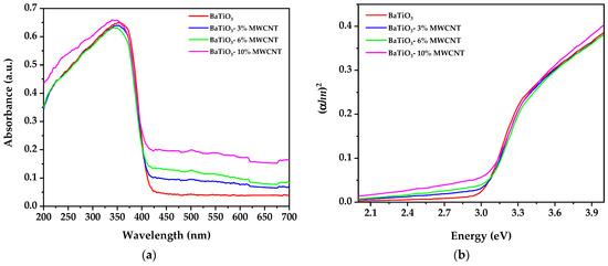 Figure 5. (a) UV–visible absorption spectra of pure BaTiO3 and BaTiO3/MWCNT composites, (b) the Tauc plot to calculate the indirect bandgap energy.