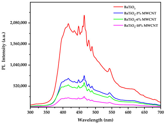 The photoluminescence emission spectra spanning 300–700 nm for pure BaTiO3 nanoparticles and multi-walled carbon nanotube-reinforced BaTiO3 nanocomposites under 254 nm excitation are presented in Figure 6.