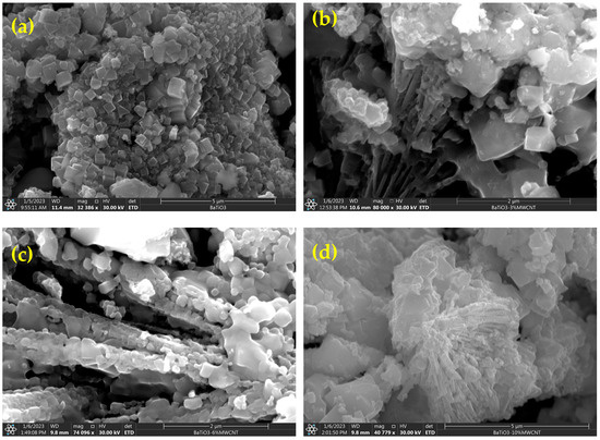 The morphology and elemental composition of pure BaTiO3 and BaTiO3/MWCNT composites were analyzed through FE-SEM (Figure 7a–d) and energy-dispersive X-ray spectroscopy (EDS). The images of pure BaTiO3 show particles with an irregular and cubic shape, with an average size of 313.17 ± 97.18 nm. The addition of MWCNT and the post-thermal treatment had a significant impact on the morphology of the particles. The resulting images reveal irregular shapes, with the MWCNTs being fully covered, as reported previously [75]. It was also observed that an increase in the concentration of MWCNT led to its agglomeration [48].