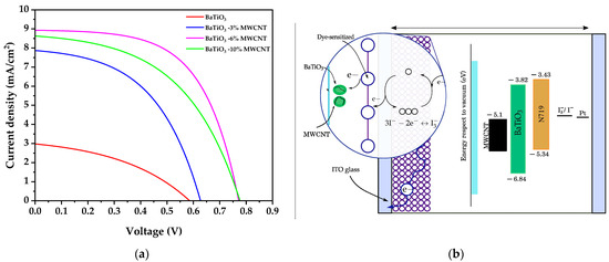 Figure 8. (a) Current density–voltage curves of pure BaTiO3 and BaTiO3/MWCNT nanocomposites and (b) schematic energy level diagram.