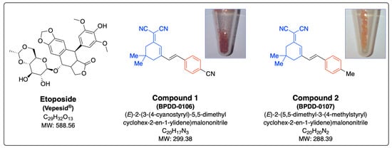 Chemicals: All commercially available anhydrous solvents, reagents, and starting materials were used without purification and in accordance with the producer’s specifications. Etoposide (≥99%, CAS#: 33419-42-0) was obtained from Key Organics Ltd. (Camelford, UK). The starting building blocks were 2-(3,5,5-trimethylcyclohex-2-en-1-ylidene)malononitrile (3, >98%, CAS#: 23051-44-7) 4-cyanobenzaldehyde (4, ≥99%, CAS#: 105-07-7), and 4-methylbenzaldehyde (5, 95–98%, CAS#: 104-87-0) and were obtained from Merck/Sigma-Aldrich (St. Louis. MO, USA) and used directly for the synthesis of compounds 1 and 2 in the presence of piperidine (for synthesis, CAS#: 110-89-4, Sigma-Aldrich, St. Louis, MO, USA) (see Supporting Information, Figure S1). The solvent N,N-dimethyl sulfoxide (DMSO, anhydrous ≥ 99.9%, CAS#: 67-68-5, Sigma-Aldrich, St. Louis, MO, USA) was used for the preparation of stock and lysis solutions for the MTT assay.