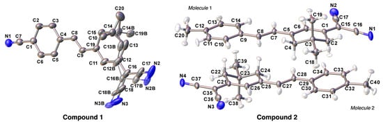 The X-ray structures were obtained according to a modified protocol after recrystallization from acetonitrile and slow crystallization at room temperature (298–300 K) []. As expected, the single X-ray analysis showed that both compounds 1 and 2 crystallized in their more favorable E-isomers. Compound 1 crystallizes in the orthorhombic space group Pna21 with Z = 4 and shows partial disorder with a ratio of 82:18, while (E)-2-(3-(5,5-dimethyl-3-(4-methylstyryl)cyclohex-2-en-1-ylidene)malononitrile (2) crystallizes in the monoclinic space group P21/n with Z = 8 (Table 1 and Figure 2). The asymmetric unit of 2 shows an antiparallel orientation of two enantiomeric molecules with the positional disorder of both methyl groups at positions C3 and C23 in molecules 1 and 2, respectively (Figure 2, right).