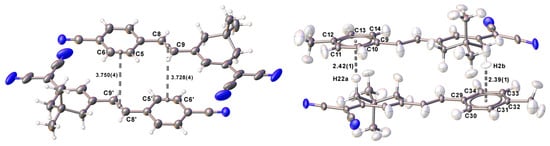 Short π-π and σ-π distances (in Å) in compounds 1 (left) and 2 (right). The minor occupied disordered part for 1 is omitted for clarity (symmetry code for C5’-C6’ and C8’-C9’: 1-X, 1-Y, −1/2 + Z).