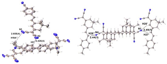 Short C-H…N distances (in Å) in compounds 1 (left) and 2 (right). The minor occupied disordered part for 1 is omitted for clarity. Symmetry codes used for 1: H5′: ½ + X, ½ − Y, +Z; H19A″: 3/2 − X, −1/2 + Y, −1/2 + Z, and for 2: H26’: ½ − X, −1/2 + Y, ½ − Z; H28”: −1/2 − X, ½ + Y, ½ − Z.