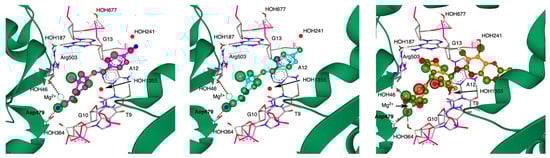 The scoring function HYDE is used for the rapid prediction of binding affinities (ΔG, in kJ/mol), as implemented in SeeSAR []. Considering the hydrogen bonds/salt bridges (approximately interpreted as the hydrogen term ΔH) and dehydration terms (approximately interpreted as the desolvation term–TΔS), SeeSAR visualizes the (HYDE-)estimated free energy of binding ΔG, in kJ/mol) using translucent spheres (HYDE “coronas”) that are colored from deep red (very unfavorable) to dark green (very favorable for affinity [,,,,]. As a result, SeeSAR estimates the binding affinity (represented as Ki HYDE ranges) and other relevant physicochemical parameters such as the approximate lipophilic ligand efficiency (LLEHYDE), ligand efficiency (LE), and others []. Therefore, based on the obtained HYDE score, the docked poses of ligands were ranked and visually inspected under consideration for their torsional quality and intra- and intermolecular clashes [].