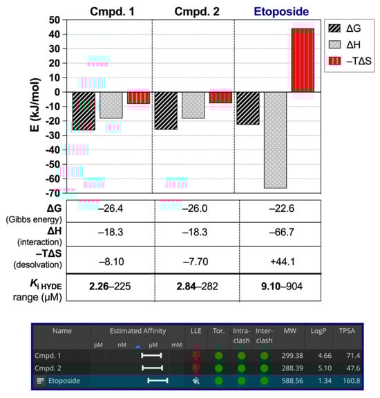 Approximate computed thermodynamic profiling of 1, 2, and the etoposide. (Top): Thermodynamic profile of compounds 1, 2 and the etoposide obtained from their best docking poses into hTOP2β (PDB: 3QX3), representing the semi-quantitative decomposition of the enthalpic (ΔH: sum of interactions; in grey bars) and entropic part (−TΔS: sum of dehydration terms; in red) for all non-hydrogen atoms of the Gibbs free energy (∆G = ∆H − T∆S, kJ/mol; in black). The respective values (in kJ/mol) and binding affinities (Ki HYDE ranges) are summarized below the diagram. (Bottom): Tabular representation of HYDE-estimated affinity ranges (white bars from µM to nM), lipophilic ligand efficiencies (LLE), torsions (Tor, green points), intra- and intermolecular clashes (green points), as well as molecular weight (MW), logP, and the topological polar surface area (TPSA) as the main physicochemical and drug-like characteristics.