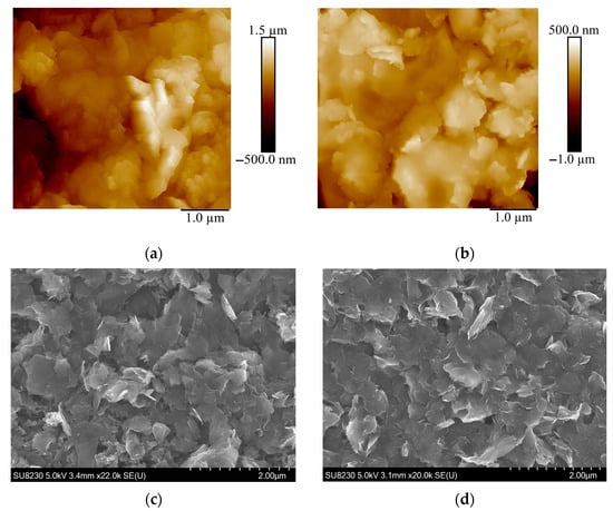 AFM images of the S1 (a) and S2 (b) samples. SEM images of the S1 (c) and S2 (d) samples.