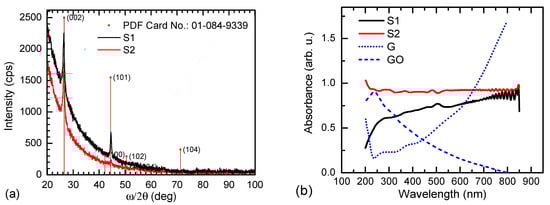 (a) GIXRD patterns of S1 and S2 samples. Diffraction peaks were identified according to the PDF Card of graphite No.: 01-084-9339. (b) Absorbance spectra of the S1 and S2 samples. Graphite oxide (GO) and graphite (G) absorbances are taken from [23].