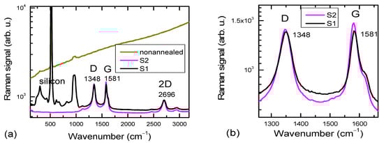 The Raman spectra are provided in Figure 4. Again, S2 shows the best properties, as evidenced by the absence of the Si peaks observed in S1. The Si peaks are present due to the large holes in the S1 layer formed after annealing (see Figure 1). In the initial non-annealed layer, the Si peaks are almost absent due to the continuous coverage of the substrate by precursor solution. Additionally, no graphite peaks were observed. D and G bands are indicated on the plots. Graphite has a very weak D band in comparison to the G band. The observed spectra are a signature of GO, in which similar D and G relative peak amplitudes and positions have been determined [26,27]. As the GIXRD patterns (Figure 3a) do not show GO, this discrepancy indicates that GO either constitutes only a small fraction of the volume of graphite nanoparticles or the formed graphite oxide is amorphous [28].