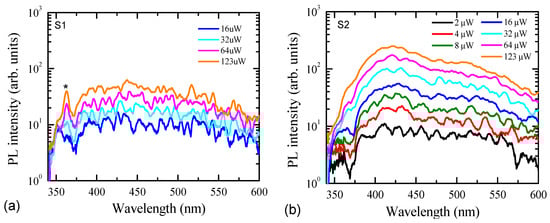 Photoluminescence spectra of the S1 (a) and S2 (b) samples at variable excitations in 10 ns time windows.