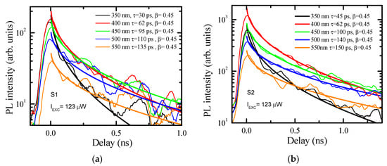 Photoluminescence decays of S1 (a) and S2 (b) samples at different emission wavelengths. The solid lines are stretch exponential fits, with parameters provided on the plots.