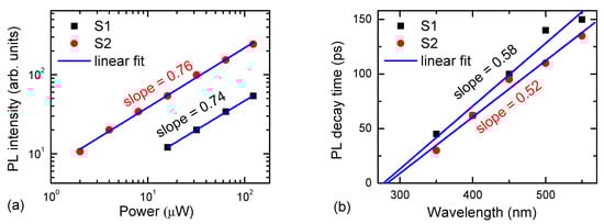 The PL intensity vs. excitation slope is close to unity, indicating a small saturation of the excitons localized on the oxygen defects (Figure 7a). Sample 1 has similar spectra and decays but almost an order of magnitude weaker PL emission—it correlates with weaker oxidation (Figure 3b) and poorer crystallite coalescence (Figure 1 and Figure 2). The spaces between the crystallites can work as nonradiative surface defects [31], leading to PL quenching. The PL decay time in Figure 7b has linear wavelength dependence in both samples, indicating a universal dependence for both layers irrespective of their emission intensity. The lifetime dependences vs. wavelength were fitted as τPL1 = 0.58 ps/nm × (λ(nm) − 275 nm) and τPL1 = 0.52 ps/nm × (λ(nm) − 281 nm) for S1 and S2, respectively. These dependences could be explained by the exciton decay limited by the thermalization in the oxygen-group defects in both samples and the cutoff wavelength of 275–281 nm (4.4 eV) can, approximately, correspond to the graphene oxide σ band with the highest energy (4.2 eV [16]). Further research is needed to obtain more efficient oxidized graphite nanoparticles for white light emitters.