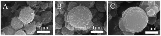 The SEM of PF, PFC, and CoNi-PFC showed that the surface roughness observed on phenolic spheres was attributed to the inclusion of the surfactant hydroxyethyl cellulose, an amphiphilic polymer (Figure 1B,C). Its adsorption onto the surface of the microspheres served to decrease the surface energy of microspheres within the system, thereby stabilizing their state and conducive to the formation of good morphology of the products [32]. The carbonization of PF microspheres and CoNi-PF microspheres (Figure 2B,C) showed that, even after carbonization, the phenolic microspheres retained their rough surface.
