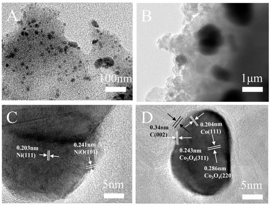 TEM images of CoNi-PFC with different magnifications (A–D).