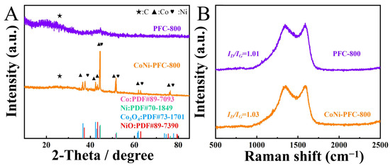 The crystal phase of the material was analyzed using XRD (Figure 3A). The diffraction peaks of PFC and CoNi-PFC at 26.4° indicated the graphite C (002) crystal plane (PDF#26-1080) [37]. Both samples exhibited similar broad peaks at 22.5°, indicating a lower degree of surface C graphitization. This observation was likely due to the presence of defects in the material [38].