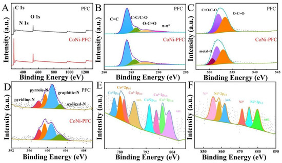 X-ray photoelectron spectroscopy (XPS) was applied to analyze the composition and chemical state of surface elements in PFC and CoNi-PFC. The elemental compositions of PFC and CoNi-PFC composites were also explored through XPS (Figure 4A–F, Table 1). In the C-1s spectra of PFC and CoNi-PFC, the broad peak was resolved into four subpeaks, indicating the presence of C=C (284.2 eV), C-C/C-O (285.0 eV), O-C=O (286.1 eV), and π-π* (288.0 eV) functional groups (Figure 4B) [40]. The O-1s spectra of PFC was deconvoluted into three peaks corresponding to metal-O (531.1 eV), C=O/C-O (532.1 eV), and O-C=O (533.5 eV, Figure 4C). The N-1s spectra of PFC and CoNi-PFC was resolved into four peaks corresponding to pyridinic-N (398.5 eV), pyrrolic-N (399.7 eV), graphitic-N (400.5 eV), and oxidized-N (402.6 eV, respectively) [41]. Pyrrolic-N and graphitic-N peaks were the dominant N configurations in PFC and CoNi-PFC. Both N species enhanced the conductivity and wettability of C [42]. The Co-2p and Ni-2p XPS spectra of CoNi-PFC exhibited two characteristic peaks at 778.4 and 794.6 eV (Figure 4E,F), corresponding to Co-2p3/2 and Co-2p1/2 of zero-valent Co, respectively. The peaks at 780.9 and 797.1 eV were assigned to Co3+2-p3/2 and Co3+-2p1/2, while the peaks at 782.4 and 798.6 eV corresponded to Co2+-2p3/2 and Co2+-2p1/2. The characteristic peaks at 786.2 and 804.1 eV represented satellite peaks [43]. This suggested that Co in CoNi-PFC existed in the form of zero-valent Co and Co3O4, consistent with XRD test results. Ni-2p had two different characteristic peaks at 856.7 and 875.2 eV, corresponding to Ni2+-2p3/2 and Ni2+-2p3/2, respectively, which was caused by NiO in nanoparticles (Figure 4F). The binding energy peaks of Ni-2p at 854.3 and 872.5 eV were attributed to Ni0 and the peaks at 861.4 and 879.9 eV were satellite peaks [44]. The XPS spectrum of Ni-2p confirmed the coexistence of Ni and NiO, while the appearance of satellite peaks indicated the presence of amorphous NiO.