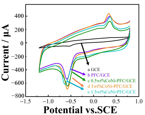 The electrochemical behavior of 2-nitrophenol at bare GCE, PFC/GCE, and different CoNi-PFC/GCE loadings were investigated by CV (Figure 5). From curve a, it is evident that the reduction capability of GCE for 2-nitrophenol was weak, with a minor reduction peak appearing at about −0.5 V, while no oxidation peak was observed at ~0.4 V. However, oxidation peaks were present in curves b, c, d, and e. It was speculated that 2-nitrophenol was first reduced to 2-hydroxyamine phenol. To compare PFC and CoNi-PFC, the activity toward the electrochemical reaction for 2-nitrophenol was calculated, with the PFC and 0.5, 1, and 1.5-wt% CoNi-PFC showing current densities at 5.12, 5.43, 5.83, and 5.01 mA∙cm−2, respectively (b–e). Notably, the reduction of 2-nitrophenol in curves c, d, and e were stronger than that in curve b. This was attributed to the addition of CoNi, which enhanced the defect level of the material, exposed more active sites, and augmented the conductivity and electron transfer rate of the composite through the synergistic coupling effects of C and CoNi. However, loading more CoNi could block some C active sites, resulting in a decrease in the current density [45,46].