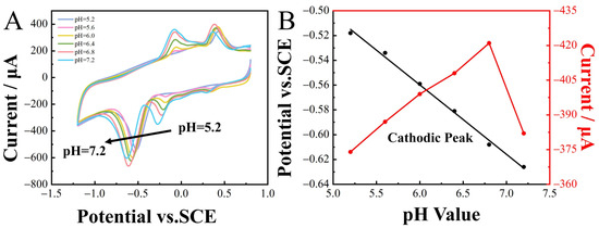 When detecting the target substance, the pH of the supporting electrolyte significantly influenced the detection results. Therefore, CV analysis was conducted to investigate the impact of pH on the reduction peak potentials of 2-nitrophenol (100 µM). The pH of the 0.1 M CPB buffer solution was adjusted within the range of 5.6 to 7.2. Optimal current responses were observed at pH 6.8 and, consequently, selected as the optimal buffer environment for subsequent electrochemical measurements. The reduction peaks of 2-nitrophenol shifted in the negative direction as the pH ranged from 5.6 to 7.2, demonstrating the transfer of protons in the reaction and showing a linear relationship between Epc and pH (Figure 6A), expressed as