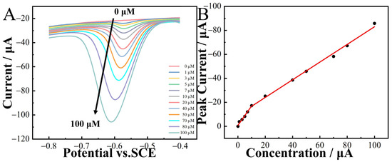 The DPV method was employed for the quantitative detection of 2-nitrophenol in a 0.1 M CPB solution. The results revealed a substantial increase in the peak current with the rise in 2-nitrophenol concentrations (Figure 8A). Furthermore, within the concentration range of 0–100 µM, a linear relationship existed between the peak current and concentration. The linear regression equations were