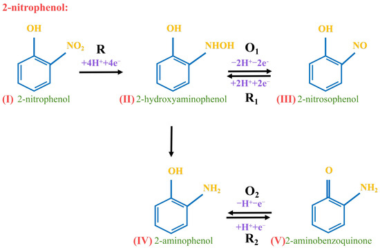 Based on ER = Eθ − (0.059 m/n) pH [47], the reaction of 2-nitrophenol involved an equal number of electrons and protons. The 2-nitrophenol was reduced to hydroxylaminophenol via a 4 H+ and 4 e− process [48].