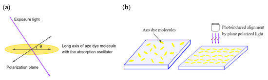 Irradiation of azo dye molecules by linearly polarized light leads to light absorption in such a way that the potential energy of interaction between electromagnetic waves and azo dye nanolayer spontaneous polarization is proportional to , where is the angle between the absorption oscillator (parallel to the long axis of the azo dye molecules) and the polarization plane (see Figure 1a). As a result, azo dye molecules have an excess of energy and randomly reorient to minimize the potential energy. In other words, this is a process of the formation of equilibrium statistical distribution of potential energy over the rotational degrees of freedom of molecules, and it is described by the rotational diffusion model [16]. Typically, the exposure process lasts from 10 to 60 s and the exposure time depends on the azo dye thickness.