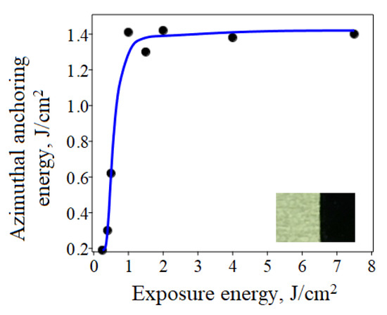 An important property of photoalignment is the saturated dependence of the azimuthal anchoring energy versus the exposure energy (λ = 365 nm or 450 nm) [15]. Thus, the pretilt angle of LCs becomes controllable and the quality of the photoaligned LC cell is comparable with the rubbing technology (see Figure 2).
