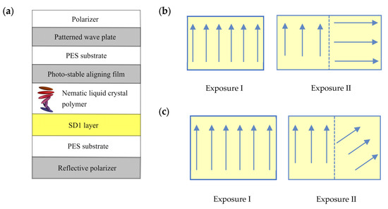 A polarimetry sensor uses a patterned micro-polarizer array, which is fabricated by photoalignment in combination with a metal-oxide-semiconductor (CMOS) backplane image sensor for the simultaneous detection of four Stokes parameters in an output optical image (Figure 6b) [44]. There is a stringent requirement for normal light incidence, which makes applications with oblique incident light infeasible. The size of the micro-polarizer array pixels is 5×5 µm, and a thickness of 0.95 µm is achieved by using photoalignment of SD1 nanolayer across the 400–700 nm visible spectrum range. The micro-polarizer array includes a multi-domain matrix of polarizers with a patterned SD1 layer, which is used to align another azo dye molecular layer (azo dye 1, AD1), which is capable of polarizing light. The proposed geometry of micro-polarizers makes it possible to detect three Stokes parameters of light (S0, S1, S2). The light transmitted through each domain will have different polarization characteristics (0°, 90°, or ±45°). Right- or left-handed circular polarized light can be detected by using a phase retarder, placed after the micro-polarizer array.