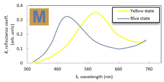 The color and contrast ratio are defined by the fast axis of the wave plate and the optical path difference. Successive simulation of the reflected color spectra in MOUSE-LCD results in blue and yellow monochromatic images with a reflectance coefficient greater than 30%. Then, the images were merged into a single letter “M” (see Figure 4).