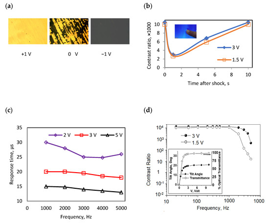 Electrooptical response of ESH FLC mode: (a) optical microphotographs of bright and dark states (±1V) [32]; (b) mechanical stability, i.e., full recovery of the optical image after the mechanical shock; (c) frequency dependence of ESH FLC response time for different voltages; (d) contrast ratio of ESH FLC as a function of frequency for nm [33].