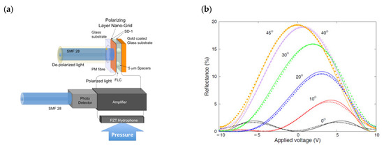 The linear response in a reflective deformed helix ferroelectric (DHF) FLC cell enables applications in fiber Bragg grating sensors. These sensors have inherent sensitivity to temperature changes, axial strain, and pressure [45], i.e., observable as a shift in the Bragg wavelength in the reflected/transmitted power spectrum. The sensor head consists of an FLC cell, which acts as a variable electric-field-controlled polarizer. Application of an electric field across the cell leads to rotation of the optical axis around the axis parallel to the electric field, which results in a change in the dielectric tensor. This mechanism is the basis of the sensor functionality (see Figure 7a [46]). Alignment of FLC with the submicron helix pitch is obtained by making a 10 nm thick photoaligned layer on the golden electrode prior to injecting LC into the cell. The operating principle of the LC sensor is as follows: an optical fiber is attached by glue to the top glass substrate. The glass substrate has an aperture, which is fitted for a single-mode optical fiber, and a golden coating in front of the fiber tip is patterned to form a grid with a 200 nm period. Consequently, light travels through the following parts of the device: (1) the front golden electrode (–), which represents a nanowire grid (i.e., a linear polarizer); (2) photoaligned layer (light blue); (3) an LC layer; (4) second alignment layer (light blue); and (5) rear golden electrode (+), which plays the role of a broad band mirror for light reflection into the fiber. The reflected light has linear polarization and the LC cell exhibits a continuous hysteresis-free optical phase delay. The reflectivity can be measured by means of the integrated single-mode fiber using unpolarized light (λ = 1.55 μm). The operating conditions are chosen to maximize the modulation in reflectance and obtain a linear response , see Figure 7b [47,48]. One can note that at zero voltage, the crossed polarizer’s reflectance achieves its maximum value for ° and vanishes for . Fiber Bragg sensors have already been applied to measure flow velocity and pressure in pipelines.