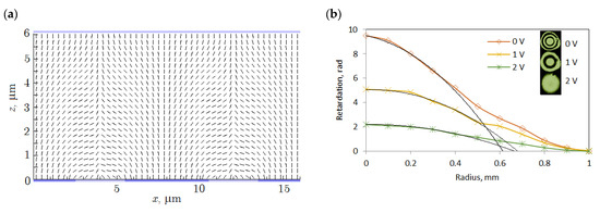Control of the pretilt angle of the director leads to the opportunity for the fabrication of low-power-consuming tunable LC lenses [52]. A laser beam with a Gaussian intensity profile induces a spatially variable pretilt angle ranging between 1 and 89°. In order to generate spatially variable UV irradiance, a mask with a circular structure of radius R is placed at a distance D from the substrate (Figure 8a). Liquid crystal molecules are planar aligned between electrodes. Because the profile of the refractive index n(x,z) depends on the applied electric field, then the corresponding retardation parameter profile also shows smooth parabolic dependences versus the radius of the photomask, where is the effective refractive index between the lens center and its edge (Figure 8b). Investigation of interference patterns shows that the increase in voltage forms declinations in LC cells, and optical properties become distorted (see the inset in Figure 8b) [53].
