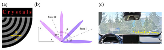 The focusing properties of the Fresnel lens are electric-field-controlled, show high diffraction efficiency, and a quick response time. Orthogonal alignment of the domains is achieved by using a hybrid photoalignment technique of LCs (Figure 9a,b), where the dashed lines represent smectic layer normal and is the smectic cone angle [56]. Typical radii of the inner domain can range within 250–350 μm. Accordingly, the director can rotate an angle of in each domain. Orientation of the easy axis between the neighboring zones can make angle either or with the switching time of 120 µs and the diffraction efficiency of 37%, which is close to the theoretical limit of 40%. If an FLC Fresnel lens is used with a patterned polarized screen, a projection of a color image becomes possible. Focus (diffractive)/Off (dark) mode occurs when and Focus/Defocus (transmission) mode occurs when . A prototype application of the Fresnel lens is depicted in Figure 9c. A focus spot size of 25 µm achieves a diffraction efficiency of 34% for the diffracted beam of the first order [57]. Note that the light intensity at the focusing spot corresponding to a specific wavelength is governed by the applied voltage and significantly increases illumination at the observation point. Thus, with the described characteristics, photoaligned Fresnel zone plates have significant potential for applications in advanced electro-optical devices.