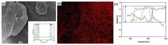 The graphene nanoflakes (GNFs) used in this study were obtained from Jiangsu XFNANO Materials Tech Co. Ltd. (Nanjing, China). Figure 1 presents the scanning electron microscope (SEM) image of the pristine GNFs, while the energy-dispersive X-ray spectroscopy (EDS) mapping results confirm the presence of carbon (C) elements within the GNFs. Raman spectroscopy analysis reveals three characteristic peaks, indicating the high crystallinity of the GNFs’ surfaces [39]. Additionally, the images in Figure 1c showcase the original atomic force microscope (AFM) images of the GNFs, highlighting an average thickness of 1–3 μm.