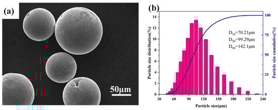 The Ti-6Al-4V (TC4) powders utilized in this study were commercially obtained from Xi’an Sino-Euro Materials Technologies Co. Ltd. (Xi’an, China). These powders were manufactured using a plasma rotating electrode process (PREP), starting from machined forging processed bars. The morphology and size distribution of the powders are depicted in Figure 2. The chemical composition of the TC4 powder was determined using an inductively coupled plasma atomic emission spectrometer (ICP-AES), and the results are presented in Table 1. It should be noted that the oxygen content on the powder surface complies. The chemicals used in the experiment were sourced from Nanjing WANQING Chemical Glassware & Instrument Co. Ltd. (Nanjing, China).