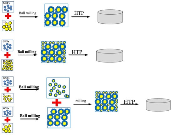 Graphene has been introduced as a reinforcement material using powder metallurgy techniques for the high-performance TMCs [30]. The properties of these composites are influenced by various factors, including the volume fraction, distribution, and size of the reinforcement, as well as the density and bonding between the matrix and reinforcement [31,32,33,34]. Among these factors, achieving a uniform dispersion of graphene within the metal matrix is a crucial requirement in the manufacturing process of titanium matrix composites. Several researchers have developed models to describe the impact of these factors on the composite properties. Previously, Dong et al. [35] successfully dispersed 0.3 wt% graphene oxide nanosheets (GONs) into pure Ti powders using a hydrothermal synthesis method. The resulting GON/Ti composites were sintered via spark plasma sintering (SPS). Their findings revealed a 9.7% increase in tensile strength compared to that of the sintered pure Ti matrix. However, despite significant increases in graphene content, the mechanical properties of Ti-based composites often reach a plateau and cannot be further improved [36,37,38].