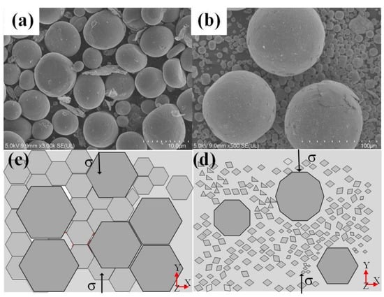 The SEM images of composite powders prepared with different process routings and corresponding schematic diagrams: (a,c) Process B; (b,d) Process C.