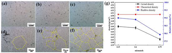 Effects of mismatch coefficients on surface morphology of the GNF(Ni)/TC4: (a,d) Φ0.15, (b,e) Φ0.4, (c,f) Φ0.75; The density of TC4/GNF(Ni) composites with (g) different mismatches.