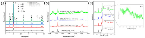 (a) XRD pattern, (b) Raman spectrum and (c) XPS wide scan of the GNF(Ni)/TC4 composites with different mismatches.