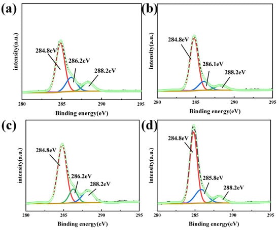 XPS analysis was performed to determine the composition of the 0.5 wt% GNF(Ni)/TC4 composites and validate the presence of defects in the GNF structure under different mismatch coefficients. In Figure 7, the C 1s characteristic peaks of the composites are observed after sintering. The fitting results revealed specific peaks at 284.8 eV, 286.2 eV, and 288.2 eV, which corresponded to the C 1s levels of C=C sp2, C–C sp3, and C–O, respectively. These findings were consistent with the XPS data of carbide and carbon-related functional groups.