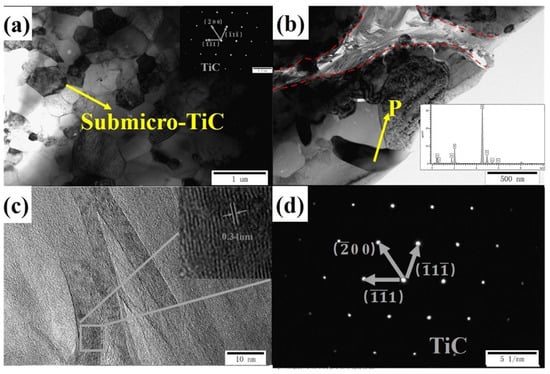 Moreover, high-magnification photography shows that the size of the reinforced phase is at the nanometer level. The EDS analysis in Figure 8d indicates that the carbon element is primarily distributed in the graphene, and the sediment on its surface only contains Ti and C. Based on the XRD results, it can be identified that the enhanced phase at the boundary of the network structure is TiC, which is generated in situ during the fabrication process. Lastly, the EDS data reveal that the atomic percentages of the Ni element and P element are 1% and 0.31%, respectively, in the composite.