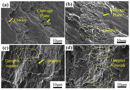 Fractures with more ductile characteristics, such as tendon-like features, indicate greater plasticity compared to cleavage fracture surfaces of brittle fractures. Upon closer examination, it can be observed that the dimple depth on the surface of the Φ0.75 GNF(Ni)/TC4 composite is deeper than that of other samples. The decreased mismatch in the Φ0.75 composite results in increased brittleness, causing some areas of the fracture morphology to exhibit large, flat surfaces resembling cleavage steps.