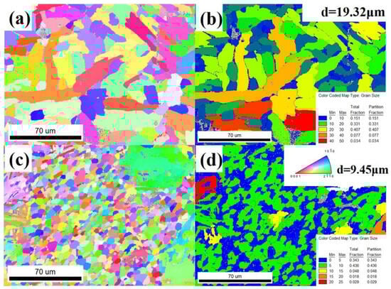 The EBSD-IPF plots of composites s prepared with different mismatches and corresponding grain size distributions: (a,b) Φ0; (c,d) Φ0.4.