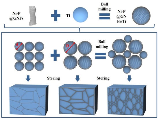 To address these challenges, the development of alternative methods for producing multi-scale titanium matrix composites (TMCs) becomes crucial. Powder metallurgy has emerged as an ideal technique for fabricating TMCs with a sandwich structure, utilizing discontinuous reinforcement [26,27,28]. In a study by Mu et al. [29], an immersion reduction method was proposed to introduce nickel-coated graphite flakes into titanium alloys, establishing a mechanical–metallurgical synergy between the graphite nanofibers (GNFs) and titanium. The significant improvement in composite strength can be attributed to the uniform distribution of nickel-coated graphite nanofibers within the titanium matrix, as well as the formation of special interfaces. In line with the successful development of the discontinuously reinforced titanium matrix composites (DRTMCs) mentioned in the literature, the present experiment aims to utilize powder metallurgy to create a two-scale structure with favorable interface characteristics. The objective of this research is to achieve superior strength and ductility in the resulting TMCs.