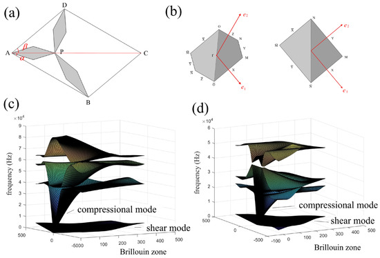 Besides the rhombic cells, other types of parallelograms can also be used as pentamode unit cells [27], which provide more adjustable parameters for studying the characteristics of two-dimensional PMs. A unit cell of a parallelogram is shown in Figure 3a. By changing the angles α and β, different unit cells can be obtained. More specifically, if the sum of α and β equals 90°, a rectangle is obtained. The Brillouin zones of parallelogram-shaped and rectangular unit cells are shown in Figure 3b. The band structures over half of their Brillouin zones are shown in Figure 3c,d. Within certain frequency ranges, there are only compressional modes, while shear modes exist only at lower and higher frequencies. Anisotropy is introduced for these unit cells and varies as the shape of the unit cell changes. The position of joint P can also be changed to alter the effective properties and anisotropy.