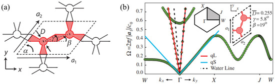 Similarly, Layman et al. [28] used parallelograms as basic unit cells to construct a slanted honeycomb lattice, as shown in Figure 4a. The struts were connected by circular joints, and the dimension of the joints were an important parameter in affecting the effective properties. The band structures of a unit cell are shown in Figure 4b. The compressional wave velocity was much larger than the shear wave velocity, and there was a frequency range where only the compressional mode existed. The bulk effective properties were tuned with variation in the cell geometry and structure parameters. High anisotropy was achieved. The anisotropy in the stiffness of the unit cells can exceed three orders of magnitude, which is highly advantageous for many acoustic devices that require anisotropy.