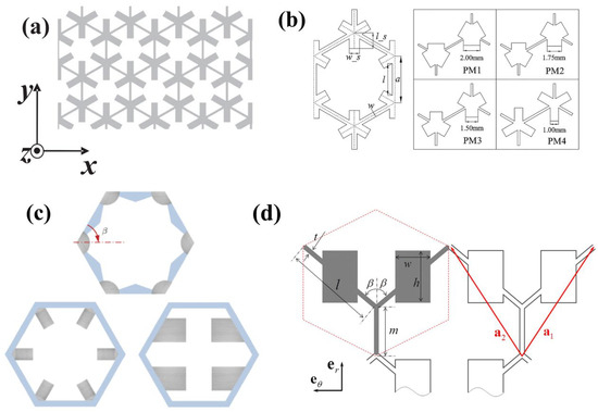 Honeycomb structures are the basic units of two-dimensional PMs. Additional masses can be added to tune the effective properties of two-dimensional PMs. Honeycomb structures with star arms arranged at the joints, as shown in Figure 5a, were proposed by Hladky-Hennion et al. [22]. The effective density, bulk modulus, and shear modulus can be tuned to 1000 kg/m3, 2.25 GPa, and 0.065 GPa, respectively, which are close to those of water. Cai et al. [29] studied four types of unit cells with different star arms at the joints. They found that, in PMs, the acoustic wave might propagate with two different propagation modes, i.e., the longitudinal wave mode and the bending mode. If the longitudinal wave mode dominates, the PMs will exhibit the same acoustic properties as fluids. Conversely, if the bending mode plays a dominant role, the acoustic properties will be entirely different. Additional masses can be added to other parts besides the joints, as shown in Figure 5c,d [30,31]. The structures introduced more parameters to alter the effective properties. The structures can be used to build materials that work similarly to water, and they can introduce anisotropy to build amazing acoustic devices.