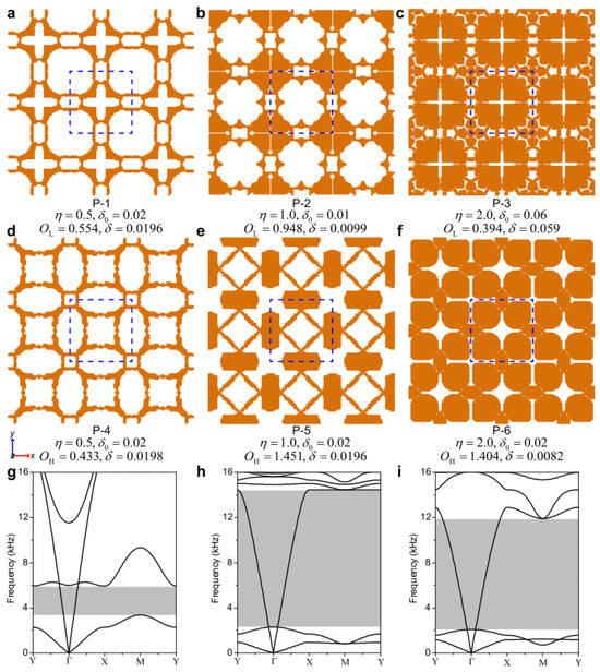 Several PMs designed with topology and representative band structures: (a–c) Three 3 × 3 microstructures with their representative prescribed η and δ0 using the low-order optimization. (d–f) Three 3 × 3 microstructures with their representative prescribed η and δ0 using the high-order optimization. Dash line represents a C4v-symmetry PM microstructure, (g–i) Dispersion relations from Bloch-wave analysis for P-1 (g), P-5 (h) and P-6 (i), respectively. The shadowed areas represent the bandgaps [32].