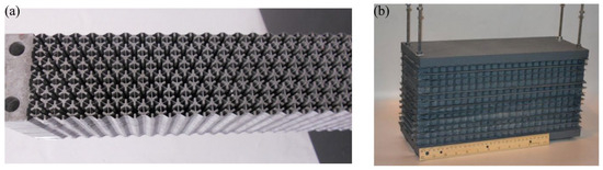 An acoustic lens with negative refraction was designed by Hladky-Hennion et al. [22]. The acoustic lens was a two-dimensional model composed of units of phononic crystals. A cylindrical wave below the lens can be focused at one point above the lens. Waterjet cutting technology was used to fabricate a sample with aluminum as the base material, as shown in Figure 8a. The sample was 75 mm high and 265 mm wide, with thickness of between 58.1 mm and 60 mm. The lens was assembled from 15 aluminum plates, each with a thickness of 5 mm. Another acoustic lens of the gradient index was designed by Su et al. [36]. The lens was assembled from 12 lens pieces and 1-mm-thick neoprene gaskets, alternately, and mounted by two 2-cm-thick aluminum end caps with 4 steel rods, as shown in Figure 8b. Each pentamode plate was 1.5 cm thick and was fabricated using abrasive waterjet cutting technology. The maximum discrepancy was 0.5 mm from the desired dimension, with an average difference of 0.2 mm. The experimental results show that they both have good performance in the focus of acoustic energy.