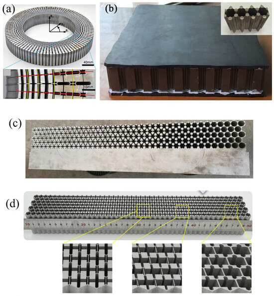 Acoustic devices processed by wire EDM: (a) acoustic cloak [37], (b) water-like material [38], (c) underwater sound reflection meta-surface [39], and (d) cylindrical wave to plane wave converter [19].